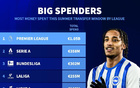 德轉(zhuǎn)列今夏各聯(lián)賽支出榜:英超10.5億居首,意德西法共計(jì)10.28億
